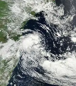 Hurricane Catarina was an extraordinarily rare hurricane-strength tropical cyclone, forming in the southern Atlantic Ocean in March 2004.[13] Just after becoming a hurricane, it hit the southern coast of Brazil in the state of Santa Catarina on the evening of 28 March, with winds up to 100 miles per hour (160 km/h) making it a Category 2-equivalent cyclone on the Saffir–Simpson hurricane scale.[14] Catarina killed 3 to 11 people and caused millions of dollars in damage in Brazil.[15]