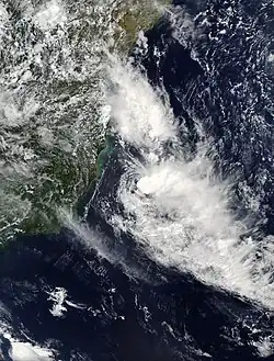 On 22 March 2019, a low-pressure area formed off the coast of Bahia after the passage of a frontal system.[57] On the next day, the cyclone developed a deep warm-core, thus being designated as a tropical depression.[57][58][59] On 24 March, the system intensified into a tropical storm, receiving the name Iba from the Brazilian Navy Hydrographic Center.[57] After moving southwestward for a couple of days, on 26 March, Iba reached its peak intensity.[57] Afterward, a cold front would approach the storm, which helped intensify the wind shear impacting Iba, leading to its weakening and extratropical transition.[57] On early 28 March, Iba would degenerate into a remnant low, becoming fully extratropical a day later.[57][60]