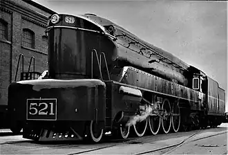 The South Australian Railways 520 class, also known as "The Whispering Giants", is a class of streamliner 4-8-4 'Northern' type steam locomotive operated by the former South Australian Railways. The 520 class is one of the fastest Australian-built steam locomotives, with locomotive No. 520 holding a verified speed record of over 78mph on the Port Pirie line on 10 November 1943.[1]