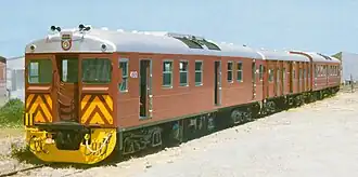![]() A typical 3-car Red Hen consist in original livery at the National Railway Museum, Port Adelaide: 400 class double-ended power car no. 400, 860 class trailer no. 875, and a 300 class single-ended power car no. 321 | |