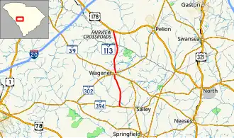 South Carolina Highway 113 (SC 113) is a 13.610-mile-long (21.903 km) state highway in the U.S. state of South Carolina. The highway connects rural areas of Aiken and Lexington counties with Wagener.