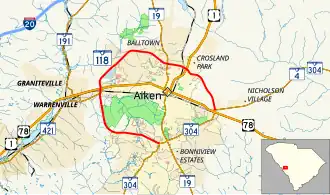 South Carolina Highway 118 (SC 118) is a 13.180-mile (21.211 km) state highway in the U.S. state of South Carolina. The highway, in combination with SC 302, create a non-freeway beltway around downtown Aiken. The highway is officially designated on the road around the southwestern, western, and northern sides of the city. The southeastern portion of the beltway is part of SC 302, which is the termini of SC 118.