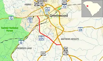 SC 225 begins at the U.S. Route 25 (US 25)/US 178 concurrency southeast of Greenwood. The highway swings around to the west side of the city where it ends at SC 72 Business (SC 72 Bus.).[2]