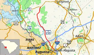 South Carolina Highway 230 (SC 230) is a 20.730-mile (33.362 km) state highway in the U.S. state of South Carolina. The highway connects North Augusta with the Sumter National Forest.
