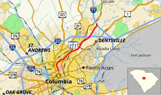 South Carolina Highway 277 (SC 277) is a 8.140-mile (13.100 km) state highway in the U.S. state of South Carolina. It travels from U.S. Route 76 (US 76) in downtown Columbia to Interstate 77 (I-77; at its exit 18) in Dentsville in Richland County.[2] For most of its length, it is a controlled-access highway conforming to interstate standards. The highway serves as a spur into Columbia from its northeastern suburbs and from intercity traffic traveling from I-77 and I-20. The freeway portion of SC 277 is called the Northeastern Freeway or I. DeQuincey Newman Freeway while the 0.7 miles (1.1 km) of surface street is part of Bull Street.