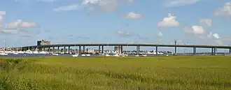 The bridge across the Ashley River is named the Robert B. Scarborough Bridge, named for a former state legislator and highway commissioner. The bridge is 2.9 miles (4.7 km) long and cost $124.7 million to build.[3] The bridge also crosses Wappoo Creek, which is a part of the Intracoastal Waterway.