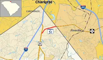 The York County segment of SC 51 is a short one-mile (1.6 km) road that starts at US 21 near Fort Mill and ends at the North Carolina state line, where it continues on as NC 51 through Pineville. The route is entirely two-lane, expanding to four lanes at the state line.[6][7]