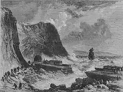 On Monday 12 February 1855 large portions of the sea wall were washed away. Despite repair work starting promptly four days later more of the sea wall and a long 70 yards (64 m) section of line were also washed away.[9] Passengers were obliged to leave their trains and carry their luggage some distance to join another.[10] A temporary viaduct was constructed by the resident engineer, Mr. Margery, and was in operation within a couple of weeks which allowed the through operation of coaches, pulled by hand and rope, although some nervous passengers still alighted and walked.[11]