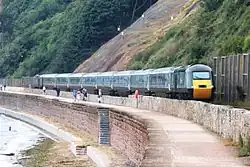 The South Devon Railway was built to the designs of Isambard Kingdom Brunel; it takes a route from Exeter which follows the River Exe to Dawlish Warren, runs beneath the sea cliffs to Teignmouth and then follows the River Teign to Newton Abbot. It follows tidal waters for about 13 miles (21 km), 4 miles (6.4 km) of which are open sea.