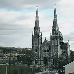 Designed by Boston architects Chickering & O'Connell in French Gothic revival style, the church was dedicated on December 17, 1922, dedicated by Bishop John J. Nilan, of the Diocese of Hartford. It was built by the Granite Construction Company of Fall River, Massachusetts. The structure is steel, overlaid with brick and faced in stone. The base is granite, with the stone above Vermont blue marble. The church has two 100-foot-tall spires, a rose window over the entrance and a copper-topped dome above the altar. Master restorer John Canning noted that the church has a very sophisticated feminine scheme, befitting the patron of the church.[2]