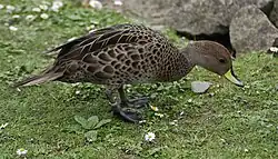 The duck is a distinctive small, mottled, predominantly brown pintail. It is smaller and stockier than the remaining mainland subspecies (A. g. spinicauda), with more uniform and darker plumage.[3] It has a reddish crown, light brown cheeks and throat, dark grey underwings and a pointed tail. The back, breast and flanks are scalloped with buff; the underparts are buffy white, mottled with brown. The bill is yellow with a blue and black line on the culmen and tip, and the feet are greenish-grey. The downy chick is dark brown with yellowish buff markings.[7]