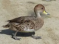The South Georgia pintail (Anas georgica georgica), also misleadingly known as the South Georgian teal,[2] is the nominate subspecies of the yellow-billed pintail (Anas georgica), a duck in the dabbling duck subfamily Anatinae. It is endemic to the large (3,756 km2) subantarctic island of South Georgia and its accompanying archipelago, and is a vagrant to the South Sandwich Islands.[3] It was among the birds noted by James Cook in January 1775, on the occasion of the first recorded landing on South Georgia,[4] and was formerly considered a full species.