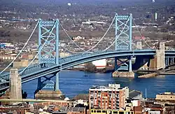 The Ben Franklin Bridge, the oldest of the four vehicular bridges crossing the Delaware River and connecting Philadelphia with South Jersey