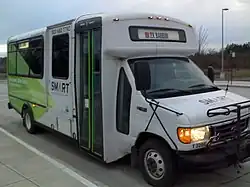 After complaints from local business owners who felt they were having to pay too much in payroll tax to support the regional transit agency, TriMet, with little or no bus service being provided in exchange, the city decided to file a formal petition to withdraw from the TriMet district.[1] Such withdrawals were allowed, if the municipality met certain conditions, under a law enacted by the Oregon Legislature in 1987. Wilsonville's petition to withdraw from the TriMet district was approved by the transit agency's board on November 30, 1988, and the withdrawal took effect on January 1, 1989. A condition of the TriMet ordinance permitting the withdrawal was that Wilsonville had to provide replacement transit service for at least one year.[1] The change enabled the city to reduce the rate of the payroll tax levied on area businesses for transit from 0.6 percent to 0.3 percent. Initially, the city provided the required replacement service by contracting with TriMet, which in turn contracted with Buck Ambulance to give service with vans.[2] However, Wilsonville later prepared to begin managing the service directly and to increase marketing of it, in hopes of improving ridership.