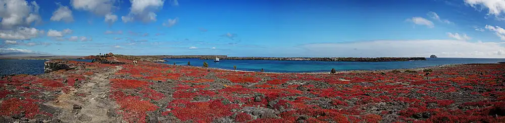 South Plaza was formed by lava up streaming from the bottom of the ocean. Despite its small size, it is home to a large number of species and known for its extraordinary flora. The sea bluffs hold large numbers of birds, such as nesting red-billed tropicbirds and swallow-tailed gulls, and offer wide vistas. The prickly pear cactus trees (Opuntia galapageia) are noteworthy, as is the large colony of Galápagos land iguanas. Furthermore, the territory and breeding season of the Galapagos land iguana overlap only on South Plaza Island with those of the marine iguana, giving rise to a unique population of hybrid iguanas.[3] Depending on the season, the Sesuvium ground vegetation changes its colour from green in the rainy season to orange and purple in the dry season.[4]