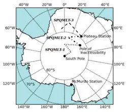 The South Pole–Queen Maud Land Traverse (SPQMLT) was a three-part scientific exploration of Antarctica undertaken by the United States in the 1960s. The three parts, referred to individually as South Pole–Queen Maud Land Traverse I, II, and III (SPQMLT-1, -2, and -3), traveled a zigzag route across nearly 4200 km of the Antarctic Plateau in the austral summers of 1964–1965, 1965–1966, and 1967–1968. The participants included scientists from Belgium, Norway, and the United States. Their objectives included determining the thickness of the Antarctic Ice Sheet, the elevation and slope of its surface, the rate of ice accumulation, and the subglacial topography. Other objectives included measuring the density and temperature of the ice at depth, measuring the geomagnetic field and gravity, and obtaining snow samples and ice cores.