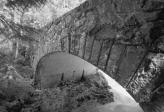 The South Puyallup River Bridge was built in 1930–31 in Mount Rainier National Park as part of the West Side Road project, planned to link the park's Nisqually and Carbon River entrances. The stone-faced reinforced concrete bridge was designed by the National Park Service and the Bureau of Public Roads. It spans 42 feet (13 m) and is almost 35 feet (11 m) wide, carrying two lanes of traffic.[2]