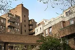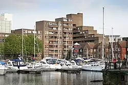 Like many of the other strategically important London Docks, St Katharine Docks were targeted by the German Luftwaffe during World War II and suffered severe damage as a result. During the "Black Saturday" raid of 7 September 1940 - officially the first day of the Blitz - the original warehouses that surrounded the Eastern Basin of the Dock were razed to the ground by German bombs.[1][2] Following the war, when the Greater London Council (GLC) embarked upon their regeneration of the area, this bomb-damaged area was selected as the site for a social housing development - South Quay Estate.