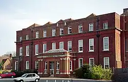 The architecture of the original building is attributed to Nicholas Hawksmoor,[7] with some alterations from around 1900[6] and the subsequent modern 1960s extensions. The original mansion is in the Queen Anne style.[42] The house itself has three storeys constructed of red brick. The ground floor level has a rubbed brick band at nine courses, and another rubbed brick band exists on the second floor, along with a moulded stone cornice level with the sills.[6]