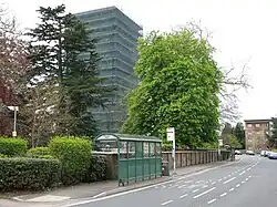 The stables and servants' quarters were demolished in 1961[5] and in 1964 a concrete tower extension was added to the hall, incorporating a bar and dining hall area. The tower contained 180 student rooms over its 17 floors and was 48.7 metres high,[23] making it the 10th-tallest building in Southampton in December 2017.[24] Despite some later claims to the contrary,[20] there is no contemporary evidence that these extensions were intended to be temporary.
