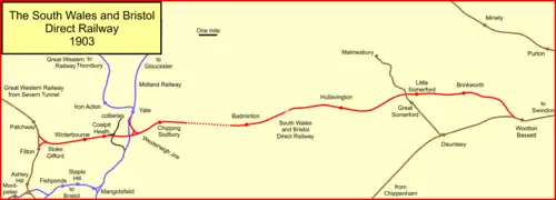 The entire route of 29+3⁄4 mi (47.9 km) was opened to passenger traffic on 1 July 1903.[4][2] A large marshalling yard was built at Stoke Gifford, with ten sidings capable of holding 500 wagons. [17] From Stoke Gifford a spur ran to Filton, towards Bristol. Intending that the line should be suitable for heavy mineral traffic from South Wales as well as express passenger trains, the steepest gradient was made at 1 in 300, and no curve of less radius than one mile; this was achieved by some heavy earthworks as well as four large viaducts, one near Somerford over the Avon and the Malmesbury Branch, and three near Winterbourne. The Chipping Sodbury Tunnel (4,444 yards, 4.064 km) was built under the ridge of the Cotswolds between Badminton and Chipping Sodbury, and the Alderton Tunnel (506 yards, 463 m) at Alderton east of Badminton.[note 7] Stations were built at Brinkworth, Little Somerford, Hullavington, Badminton, Chipping Sodbury, Coalpit Heath, and Winterbourne, and water troughs laid near Chipping Sodbury.[18][15] The stations at Little Somerford, Badminton, Chipping Sodbury and Coalpit Heath were constructed with four tracks, with platforms on the outer two, to enable through fast trains to overtake slower trains.[17]
