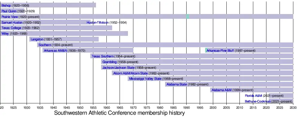 - ^ Arkansas–Pine Bluff left the SWAC after the 1969–70 school year as Arkansas AM&N; before re-joining in the 1997–98 school year as an affiliate, and to gain full member status the following season (1998–99).