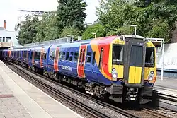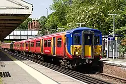 South Western Railway also operated many suburban "Metro" services in and around London. These all ran between London Waterloo and Clapham Junction, where they split into two separate routes: via Putney and via Wimbledon.[41] All services on the suburban part of the network were operated by Class 450, Class 455, Class 458 and Class 701 electric multiple units.