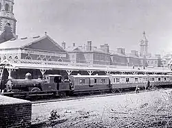 Captain Tyler of the Board of Trade carried out an inspection of the completed works on 22 February 1866; the line passed the inspection and it opened on 5 March 1866 without ceremony.[11][8] It was worked by train staff and ticket, with eight weekday trains daily each way, three on Sundays. The journey time from Southampton Docks station was 23 minutes; intermediate stops were Portswood (renamed St Denys from 1876) on the main line, then at Bitterne Road (renamed Bitterne in 1896), Woolston and Netley on the new line. It was not until 1883 that a direct siding connection was made from Netley station to the hospital; the War Office was charged interest on the capital outlay of the extension.[5]