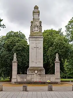 Southampton Cenotaph is a First World War memorial designed by Sir Edwin Lutyens and located in Watts Park in the southern English city of Southampton. The memorial was the first of dozens by Lutyens to be built in permanent form and it influenced his later designs, including the Cenotaph in London. It is a tapering, multi-tiered pylon which culminates in a series of diminishing layers before terminating in a sarcophagus (or cenotaph, 'empty tomb') which features a recumbent figure of a soldier. In front is an altar-like Stone of Remembrance. The cenotaph contains multiple sculptural details including a prominent cross, the town's coat of arms, and two lions. The names of the dead are inscribed on three sides. Although similar in outline, later cenotaphs by Lutyens were much more austere and featured almost no sculpture. The design uses abstract, ecumenical features and lifts the recumbent soldier high above eye level, anonymising him.