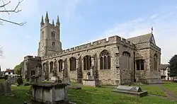 On 31 May 1940, six cockle fishing boats: the Endeavour, Letitia, Defender, Reliance, Renown and the Resolute were joined by the Southend lifeboat Greater London at the pier on their way to assist at the Dunkirk evacuation.[80][81] The town itself was first hit by German bombing in May 1940, when the Nore Yacht club was hit while 10 soldiers were killed near the airport.[82] Southend High School for Boys was hit in a raid in June 1940.[82] By June 1940, much of the town was sealed off, with all bar 10% of the population that were engaged in essential services, evacuated and only military personnel remaining.[83] A cordon of 20 miles (32 km) was set up, with the town being designated part of the coastal defence area, but with the risk of invasion dropping, in 1941 it was reduced to 10 miles (16 km).[79][84] By 28 October 1940, RAF Rochford had been renamed RAF Southend, no longer being a satellite of Hornchurch, although they still had Fighter Control at the base. A day later 264 Squadron arrived for night fighter duties equipped with the Boulton Paul Defiant.[85] In the same month, a bombing raid damaged houses in the Fleetwood Avenue in Westcliff.[82] During 1941, Prime Minister Winston Churchill visited Shoebury Garrison twice for weapon demonstrations, with the Experimental Establishment carrying out numerous trials of weird and wonderful weapons.[86] An air raid in February 1941 destroyed the London Hotel in the High Street,[87] while the foreshore was often used by German bomber aircraft as a dumping ground for their bomb loads during the war if their primary target was not possible to hit.[88]