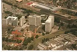 Between 1948 and 1962, it was recorded that 22% of the town's population were working in holiday related industries.[112] The borough council, concerned that Southend was too reliant on tourism and commuting, decided to try and grow commercial industry. This coincided with plans in central government to de-centralise services. Town clerk Archibald Glen wanted to re-imagine Southend as "the garden suburb by the sea".[113][114] The Miles Report of 1944 had already identified Victoria Avenue as the perfect location for office development.[115] In 1960 the council started work on a new Civic Centre. The Civic Centre would encompass a new police station that opened in 1962, a courthouse in 1966, council offices and chamber in 1967, a new College in 1971 and a Library in 1974. Plans for a fire station were shelved, but one was eventually built in Sutton Road. The new civic centre replaced the cramped facilities in Alexandra Road and Clarence Street.[116] The council in 1960 put forward a redevelopment plan, called Prospect of Southend to central government, to improve both the commercial and retail growth in the town, but the original plan and an amendment, which requested compulsory purchase orders, were both rejected by the Minister for Housing Development and Local Government.[117][118][119][120] Part of the plans included redeveloping the area north of the High Street, which included the Talza and Victoria Arcades, had been discussed with developer Hammerson. Although the plans were rejected by central government, Hammerson started a programme of buying property in the area, and in 1964 the council accepted Hammerson's plans for the site. Hammerson had by this point purchased 93% of the freeholds, and the council used Section 4 of the Town and Country Planning Act 1962 (10 & 11 Eliz. 2. c. 38) to compulsory purchase the remaining properties.[119] The development, which became Victoria Circus Shopping Centre, opened in 1970 and saw a large area of Victorian and Edwardian Southend demolished.[119][121]