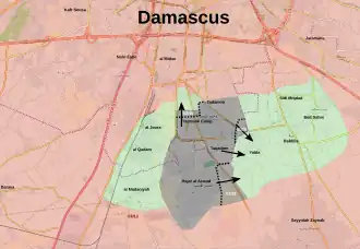 The Southern Damascus offensive (January–February 2018) began on 5 January 2018 as Jaysh al-Islam fighters attempted to infiltrate ISIL positions within the orchards situated in-between Yalda and Hajjar As-Aswad to the immediate south of Damascus city.[3] This resulted in numerous casualties and as such, a week later, on 12 January ISIL shock troops launched a counter-assault on Yalda's Zein neighborhood, triggering heavy clashes, resulting in the eventual capture of several buildings in the area.[4][5] On 22 January, ISIL made further progress in Taqdam Neighborhood of Hajjar al-Aswad, to this date ISIL ended up controlling 3/4 of Yarmouk Camp, majority of Hajjar al-Aswad, Qadam, Tadamon and large part of Yalda's eastern axis.[6] Fighting continued with ISIL forces continuing their advance against other militant groups later into January, with majority of a street between Yalda and Babbila as well as some gains within the district of Tadamon.[7] By 27 January, ISIL controlled almost the entirety of Hajjar al-Aswad after breaking through the last lines of defense and were on the verge of entering the town of Yalda, during the same time, further areas were also captured in the Yarmouk district.[8]