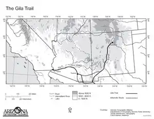 One month later, Colonel Philip St. George Cooke and the Mormon Battalion with wagons Kearny could not take across the mountains of New Mexico, followed a route south along the west bank of the Rio Grande from where Kearny had left the river, to a point just north of what later became the site of Fort Thorn. There Cooke left the Rio Grande, establishing a wagon road that reached far southwest through the Guadalupe Pass and then west just south of the current border with Mexico then west to and beyond modern Agua Prieta, before turning northward via the San Pedro River, then west to Tucson. Linking there with the Sonora Road to California established by Juan Bautista de Anza in 1774, they marched on a three-day journey north over the desert before linking up with Kearny’s route on the Gila River just east of the Pima Villages. Cooke followed the Anza–Kearny route westward along the Gila to Yuma Crossing where it had its junction with the El Camino del Diablo an old Spanish route reestablished by Mexico from 1828. This established the first southern wagon road from New Mexico to California.[1] This new wagon route became known as Cooke's Road, or Sonora Road, as much of the central part of the route passed through what was then the northern frontier of the state of Sonora, Mexico.