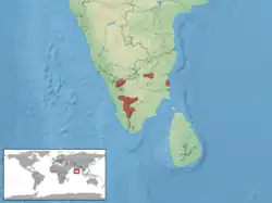 S India (Anamallays = Anailmalais, Western Ghats, Bangalore, Kolli Hills) Type locality: "Shevaroys, under stones about Yercaud and elsewhere, at an elevation of 4,000 feet".