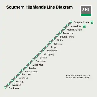 The Southern Highlands Line (SHL) is an intercity rail service that services the Macarthur, Southern Highlands and Southern Tablelands regions of New South Wales. First operating in 1869, the service runs from Campbelltown across the Main Southern railway line through to Goulburn, with peak hour services extending the route to Central. The railway service operates alongside a bus route from Picton to Bowral, operating on the route of the Picton – Mittagong loop railway line, and a regional coach service from Bundanoon to Wollongong on the South Coast Line, operating on the corridor of the Unanderra–Moss Vale railway line.