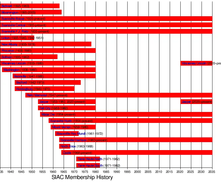 The Southern Indiana Athletic Conference (SIAC) is a high school athletic conference based in Evansville, Indiana. Five of the conferences 10 schools; Bosse, Central, Harrison, North, and Reitz; comprise the public Evansville Vanderburgh School Corporation. Mater Dei and Memorial are private Catholic high schools run by the Roman Catholic Diocese of Evansville, and the largest member is Castle, a public school located in neighboring Newburgh in Warrick County under the Warrick County School Corporation. The league was founded in 1936, and at one point stretched far across southern and western Indiana: from Mount Vernon in the west to New Albany in the east, and from Evansville in the south to Terre Haute in the north. Jasper and Vincennes Lincoln announced in May 2019 that they would leave the disbanding Big Eight Conference to rejoin the Southern Indiana Athletic Conference beginning with the 2020–21 season. Vincennes Lincoln announced in January 2025, that it will depart the SIAC for the Western Indiana Conference after the 2025-26 season, citing lack of ability to compete with the Evansville schools, setting off a possible search for a replacement which may involve schools like Heritage Hills and Gibson Southern of the Pocket Athletic Conference