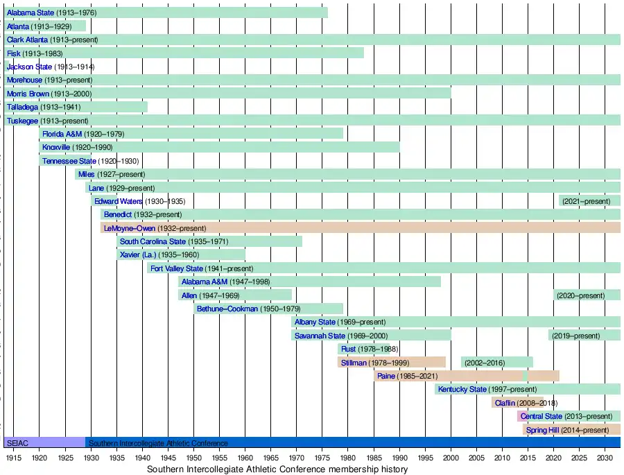 - ^ Savannah State left the SIAC after the 1999–2000 school year; but re-joined in the 2019–20 school year.