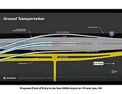 The SNSA will be accessible from Las Vegas via Interstate 15 (I-15) at the Jean exit, as well as from the towns of Goodsprings and Sandy Valley via Nevada State Route 161. Brightline West is also expected to run in tracks located between I-15 and the airport, with potential for a future connection.