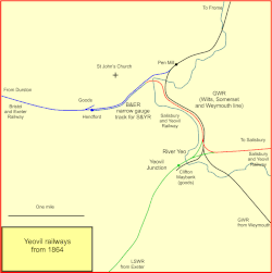 Even the Salisbury and Yeovil Railway served Yeovil itself by a branch from Bradford Abbas, a fact which lost it much initial support in Yeovil when it became known at the promotion stage.