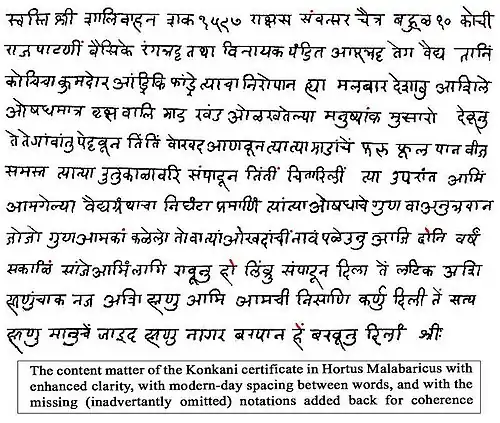 Though the book was the result of the indomitable will power of Hendrik Van Rheede, all the basic work and the original compilation of plant properties were done by three Konkani Physicians of Kochi, namely Ranga Bhat, Vināyaka Pandit and Appu Bhat.[15] The three have themselves certified this in their joint certificate in Konkani, which appears as such at the start of the first volume of the book.