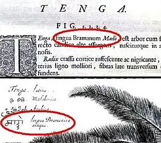 This book also contains the Konkani names of each plant, tree and creeper are also included throughout the book, in all 12 volumes, both in their descriptive parts and alongside their respective drawings. While the names are in Roman script in the descriptive part, the names alongside the diagrams are in original Nāgarī script itself, indicated as Bramanical characters.[15]