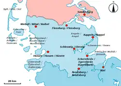 After the First World War, two referendums decided a new border.[3][4] The northern part reverted to Denmark as Nordslesvig (North Slesvig). But the middle and southern part, including Schleswig's only city, Flensburg, remained in what since the unification of Germany had become German hands. In Denmark, the loss of Flensborg sparked a political crisis, Påskekrisen or the Easter Crisis of 1920.[5][6] After the Second World War the area remained as German territory and, with Holstein, formed the new state of Schleswig-Holstein as a part of the Federal Republic of Germany (West Germany) in 1948.