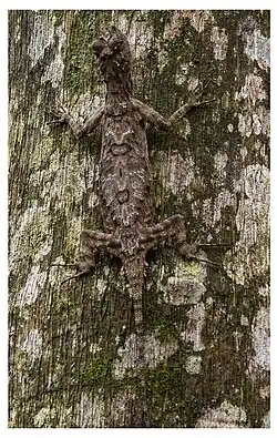 The southern flying lizard is brown with patches of grey that match the pattern of tree bark. It can change its colour to a limited extent. As an adult, it has a total length of about 23 cm (9.1 in), with a snout-to-vent length (SVL) of about 7–9 cm (2.8–3.5 in) and a tail length of 10–13 cm (3.9–5.1 in). The head is round with a short snout, and the nostrils point upwards. It is active during the day after it has warmed up in the early morning sun. Males have a long yellow dewlap which is shorter in the females. This lizard climbs trees in search of insect prey on the trunks and leaps off when it reaches the top to land on adjoining trees. It is able to glide by extending its patagia, flaps of skin on both sides of the body that are supported by six elongated ribs with special musculature to extend them outwards. The muscles on the breast are also modified to breathe more efficiently and support its active lifestyle.[3] In addition the sides of the neck are also stretched out to form a pair of smaller "wings" around the head. It is able to control the direction of the glide using its tail. The patagium is patterned on the underside with black blotches on yellow and purple. Patterns vary individually and these marking have been used to identify and estimate population sizes. A horn-like, conical tubercle behind and above the posterior part of the eye is prominent. Males have a small crest arising on the nape. The yellow gular sac on the throat is long and narrow, longer in the male. The back is rough and the throat has irregular brown spots.[4][5][6] In addition to the patagium, the hyoid apparatus (part of the tongue) expands throat lappets horizontally so that the head is also supported on its sides by small wing-like structures.[7] [8]