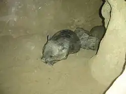 Southern hairy-nosed wombats dig and live in burrows which they connect into warrens with many entrances. These warrens are their prime refuges and are shared by up to 10 individuals.[13] A wombat digs with its fore claws while sitting up.[21] It leaves its new burrow backwards and pushes out soil with all its paws.[21] The central warren is surrounded by a circle of small, simple burrows 100–150 m (330–490 ft) from it.[19] The small burrows along the outer edges is where young wombats go when they are displaced from the central warren.[13] Wombats may favour a certain burrow and not share it with others. However, there is no monopolization of burrows.[22] Wombats move between burrows and even warrens. Male wombats are territorial towards wombats from other warrens, possibly to defend food resources and the warren refuges.[13] Trails of droppings connect the burrows. The males also mark their territory with anal scent secretions by rubbing their backs and rumps on objects.[9] Fights between males over territories or mates do occur and involve bites to the ears, flanks, or rumps.[8] Also, a dominance hierarchy exists among males.[8]