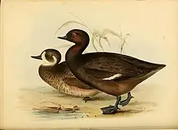 Two syntype specimens of Nyroca brunnea Eyton (Monogr. Anat., 1838, p.161., pl.23.), the African Southern Pochard, are held in the vertebrate zoology collections of National Museums Liverpool at World Museum, with accession numbers NML-VZ D832 (male adult) and NML-VZ D832a (female adult).[2] The specimens were collected in South Africa and came to the Liverpool national collection via Thomas Campbell Eyton’s collection and the 13th Earl of Derby’s collection which was bequeathed to the city of Liverpool.[2] There are two other syntype specimens, including NHMUK 1845.7.6.271, in the Natural History Museum at Tring.[3]
