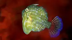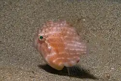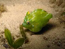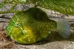The fish is a small leatherjacket with a round, almost circular body, growing to a maximum of 9 centimetres (3.5 in). They are able to inflate their abdomen.[2]