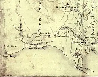 Upon arrival in Virginia, Cornwallis took command of the existing British forces in the region, which had been commanded first by Arnold and then by Major General William Phillips. Phillips, a good friend of Cornwallis, died two days before Cornwallis reached his position at Petersburg.[52] Having marched without informing Clinton of his movements (communications between the two British commanders was by sea and extremely slow, sometimes up to three weeks), Cornwallis sent word of his northward march and set about destroying American supplies in the Chesapeake region.[53]