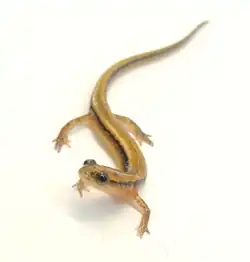 The southern two-lined salamander is a small thin salamander, distinguished by the two lines running down the lateral portion of its body. The salamander is deep-light brown and fairly small, growing up to 6.5–12 cm in length. The species has 14 costal grooves between its limbs.[3] Southern two-lined salamanders experience female-based sexual dimorphism.[4] The key difference between the Southern two lined salamander from the Northern salamander is that the black lines run all the way down to the tail. When the salamander reaches sexual maturity males begin to show Cirri and enlarged jaw muscles.