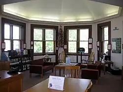 Due to numerous instances of damage due to leaks, vandalism, an old furnace, and general deterioration of a building approaching its first century, Library trustees entertained the idea of renovation in 1979, recognizing that fundraising and completion of the task could take years.[27] In 1986, after a changeover in library directors and appointment of new board members, the trustees appointed local architects Nancy L. Steelman and Thomas C. Samuels to propose renovations to the Library. With their associate Ural Taggart, the architects chose to create a three-story adjoining structure that would continue the building's original style but with fanciful touches.[21] The plan was accepted by the trustees in 1987 and a kickoff fundraiser took place on July 28, 1988. Through far-sighted vision, the Library owned much of the adjacent land. Meanwhile, the building had to be repointed for the safety of patrons. Eventually, after much fundraising (including grants), and obtaining the appropriate zoning permits, the Tromel Construction Corporation of Bay Shore was awarded the contract;[28] a groundbreaking ceremony was held on April 20, 1990.[29] The dedication of the renovated library took place exactly 100 years after the building's opening on December 15, 1991.[30]