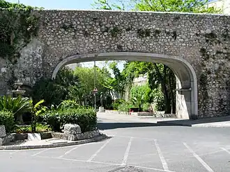 The third gate, named Referendum Gate (pictured below and at right), is the widest of the three gates.[6][11][17] Also referred to as the Referendum Arch, it was built in 1967, to the west of the first two gates.[11][15][17] The gate commemorates Gibraltar's first sovereignty referendum of 1967, in which Gibraltarians voted by an overwhelming majority to remain British rather than become Spanish.[6][11][13] The western portion of the Southport Ditch had been utilised in the 19th century as a market garden and was known as the Sunken Gardens. At the time that the Referendum Gate was opened, that part of the ditch was filled.[15][16] Trafalgar Cemetery represents a remnant of the eastern portion of the Southport Ditch, and was formerly referred to as Southport Ditch Cemetery.[14][15][16]